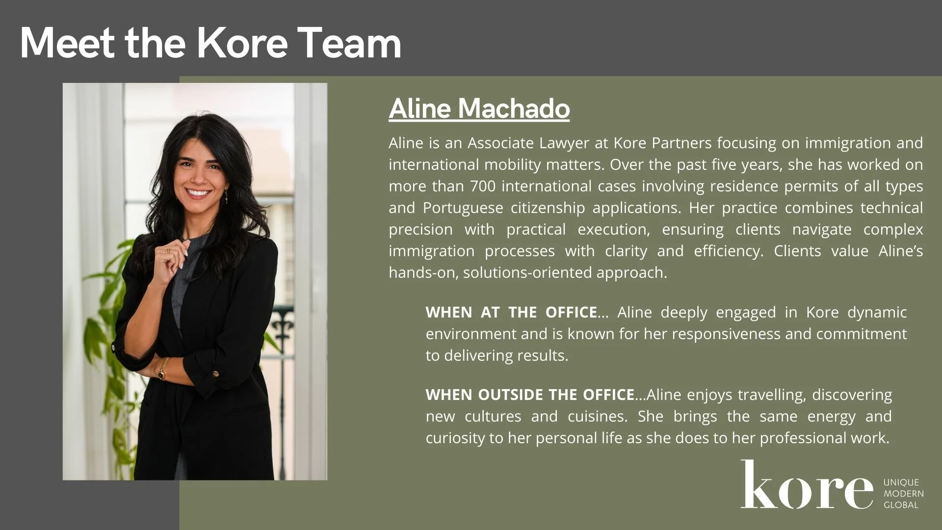 Aline is an Associate Lawyer at Kore Partners focusing on immigration and international mobility matters. Over the past five years, she has worked on more than 700 international cases involving residence permits of all types and Portuguese citizenship applications. Her practice combines technical precision with practical execution, ensuring clients navigate complex immigration processes with clarity and efficiency. Clients value Aline’s hands-on, solutions-oriented approach.