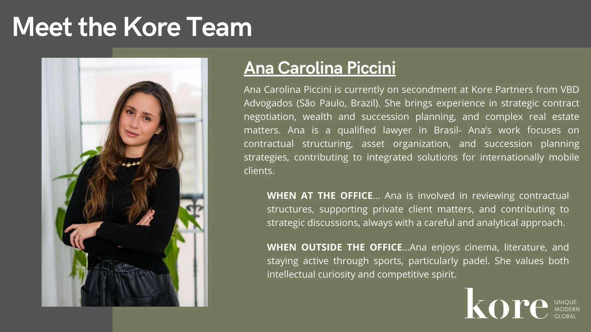 Ana Carolina Piccini is currently on secondment at Kore Partners from VBD Advogados (São Paulo, Brazil). She brings experience in strategic contract negotiation, wealth and succession planning, and complex real estate matters. Ana is a qualified lawyer in Brasil- Ana’s work focuses on contractual structuring, asset organization, and succession planning strategies, contributing to integrated solutions for internationally mobile clients.